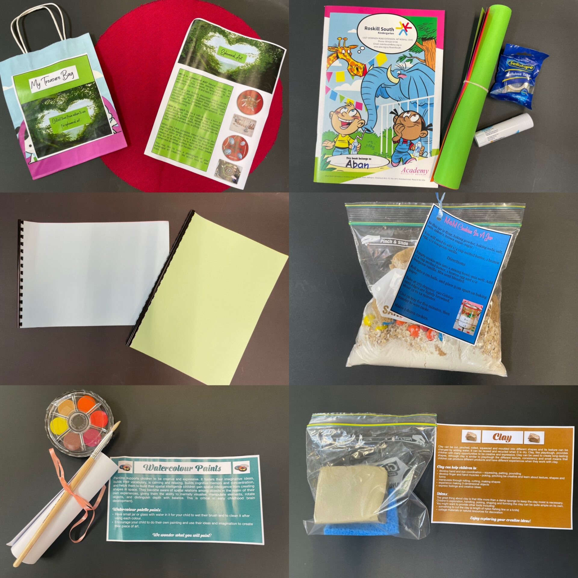 Now that we are back at kindergarten with our small bubble, we have been putting together a ‘mini’ learning pack to accompany the more comprehensive pack. Another cookie recipe and ingredients, clay, water colour paints, a ‘treasure bag’ for children to collect natural materials and a mat for them to create ephemeral art, another scrap book, and more paper and craft supplies were included in this pack. In both the packs we had information for parents on what learning their child would engage in with the resources in the pack, and ideas on participating in learning from home in a fun and meaningful way.