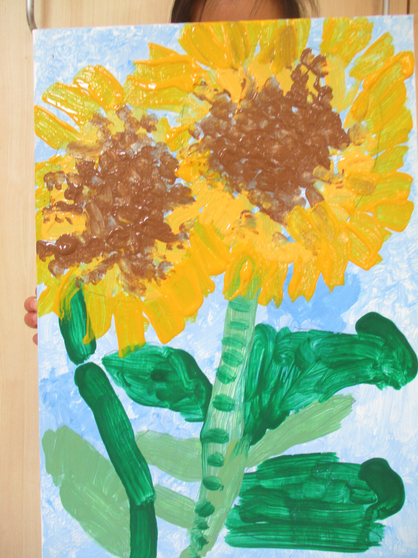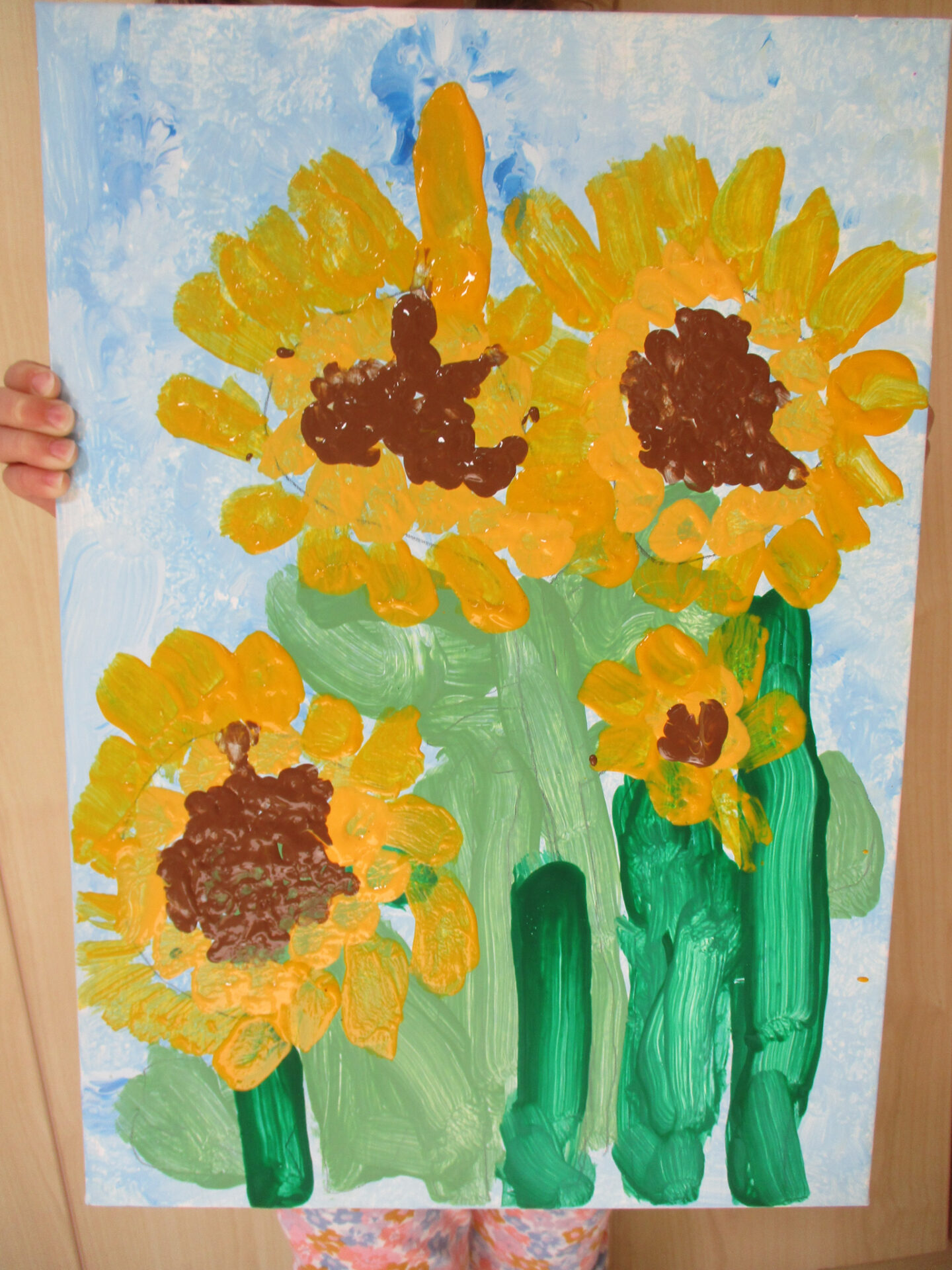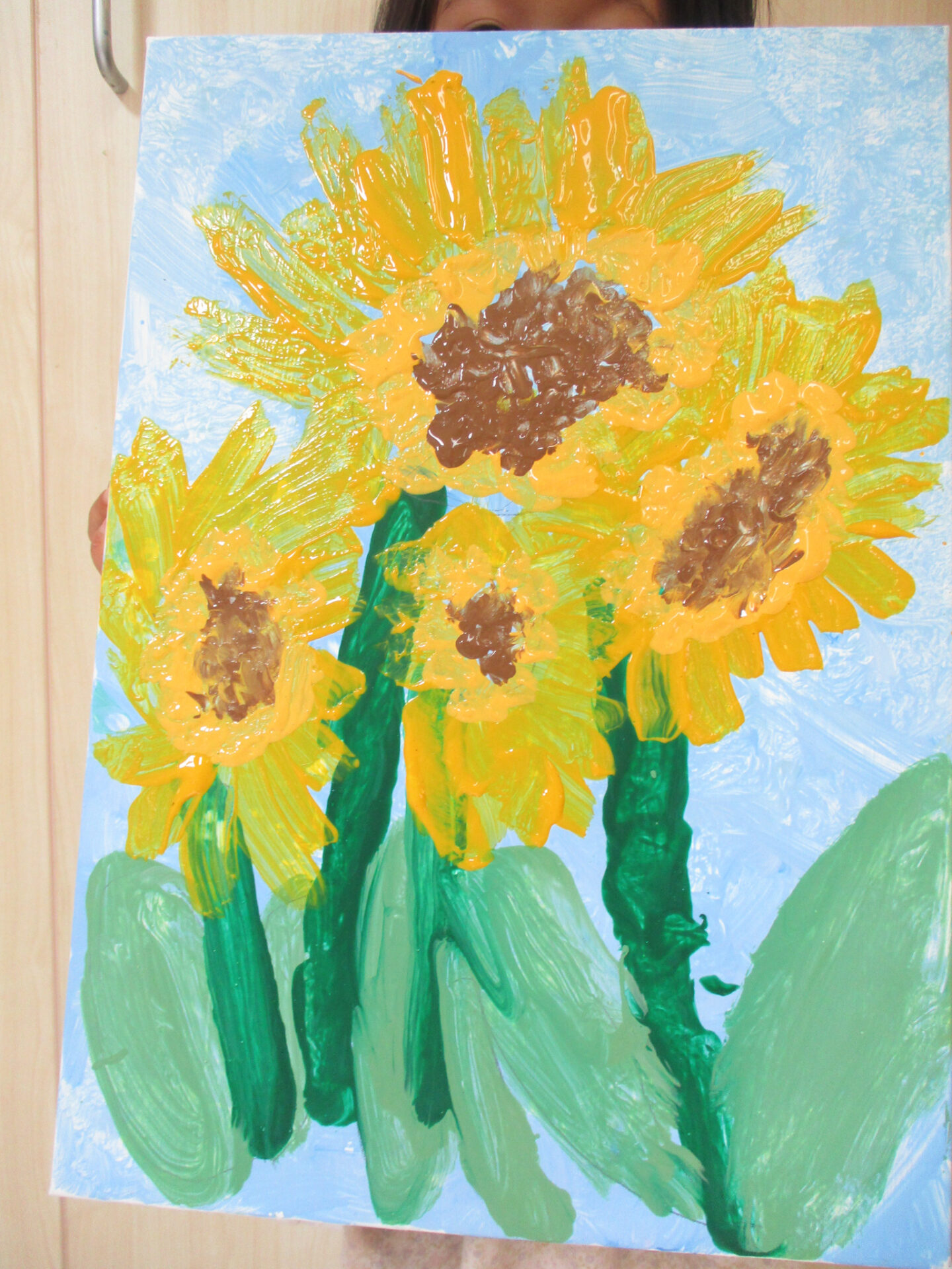 The children worked with one of our teachers to try painting on canvases. We had been inspired by the season of spring to look for some sunflowers to plant at Anchorage Park Kindergarten but couldn’t find any so we decided to paint sunflowers instead! The process required many steps, first painting the background with blue and white paint, then drawing the outlines for the leaves and painting in the shapes of the stems and leaves with the two tones of green. Later, the children painted their sunflower heads using a golden yellow, and a light golden yellow to give some definition. The inside of the sunflower heads was done using a cotton bud and a painting technique called pointillism which the children had explored earlier in the term.