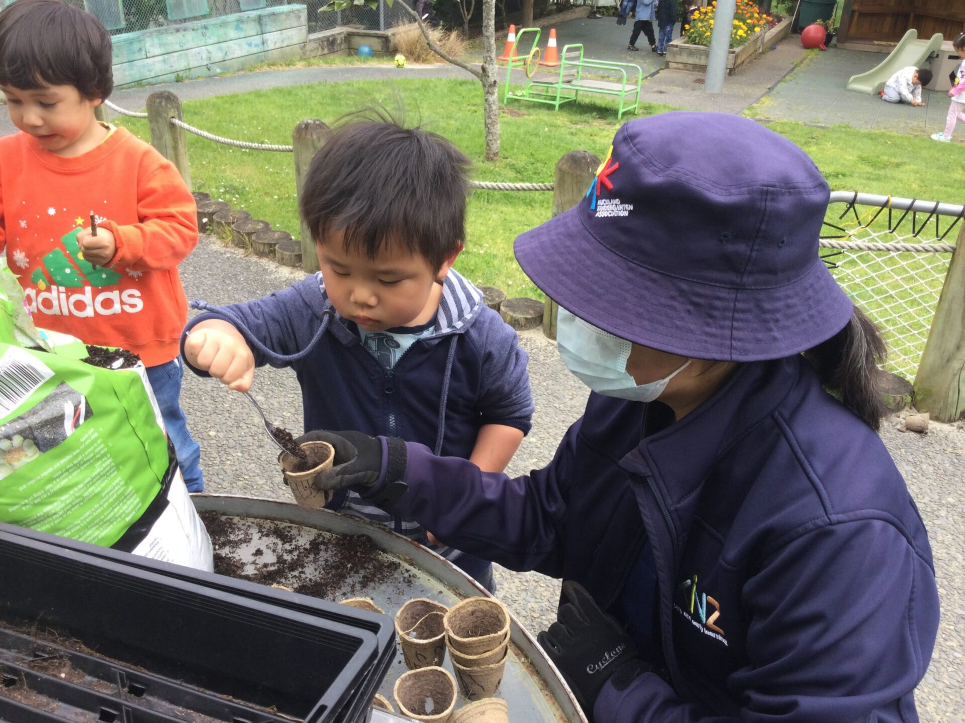 Connecting with nature is a daily ritual which tamariki enjoy at KiNZ Mission Heights. Watering, weeding, harvesting and observing the changes in the garden provides children an opportunity to develop care for living things. Through gardening experiences children express their curiosity and develop theories of things they see around them. One morning, the bubble of 10 that has been coming to KiNZ Mission Heights during the lockdown discovered that none of our overgrown, twisted sunflower seedlings looked promising so they began the process of sowing the seeds again.