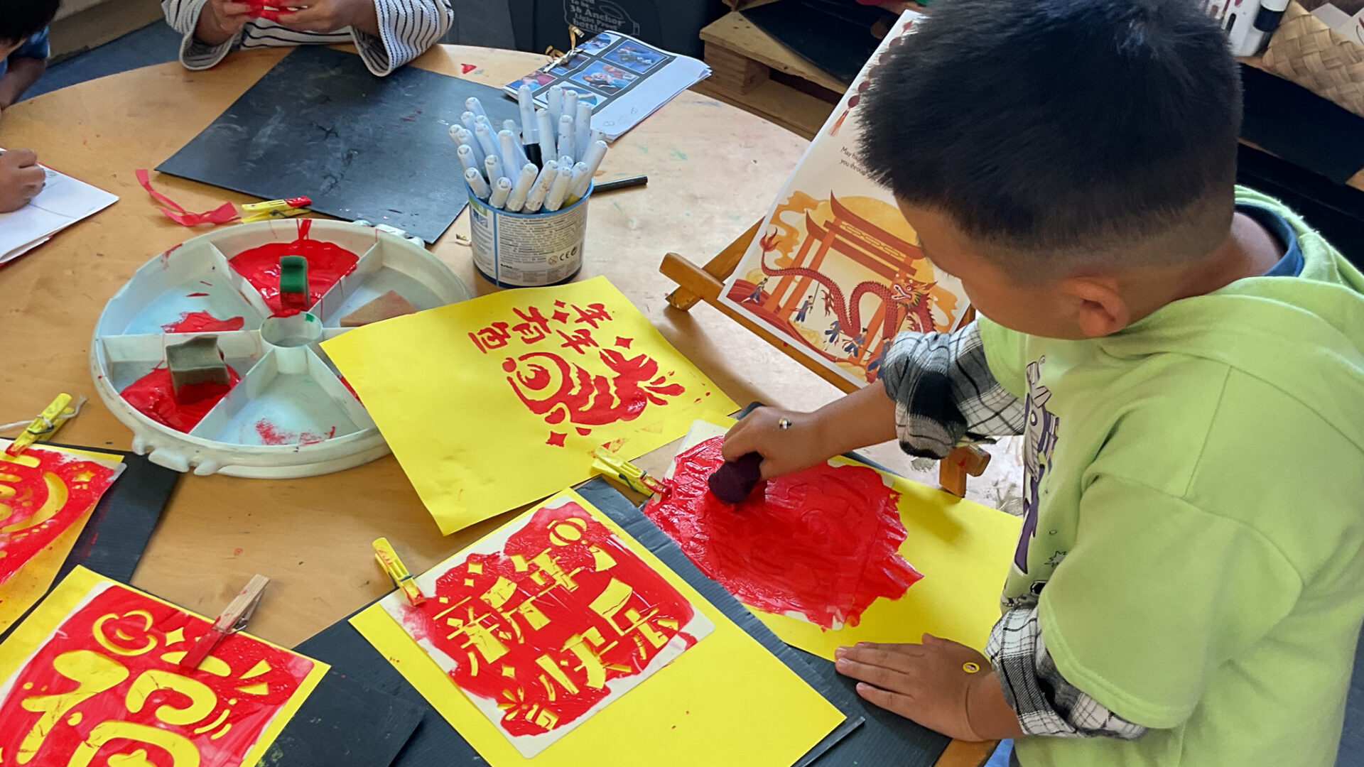 Throughout the week tamariki were immersed in a variety of hands-on experiences. We explored Chinese dragon collage, experimented with Chinese calligraphy and image printing, and learned about the intricate designs of Chinese opera masks before creating our own. Dragon masks were also a highlight, sparking imaginative play and storytelling.
