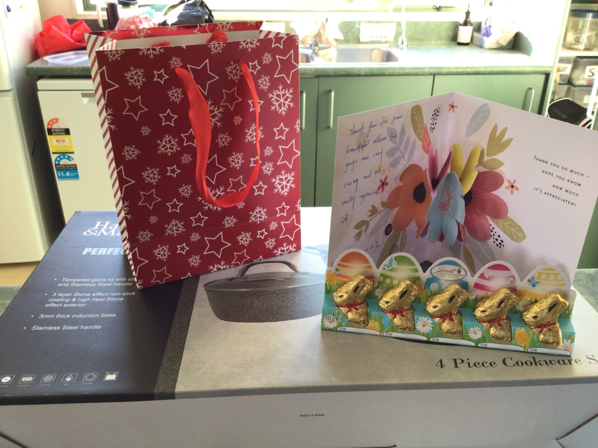 The tamariki made a beautiful card for them filled with beautiful pictures and heart felt messages of aroha. We delivered the card to the café on Friday 25 March. They weren’t there so we slid the card under the door. The following Monday they came to visit the kindergarten and kindly dropped off some chocolate Easter bunnies for all of the children and some pots and pans for the kindergarten to use. They were very touched by our kind gesture and we were very touched by their kindness in return.