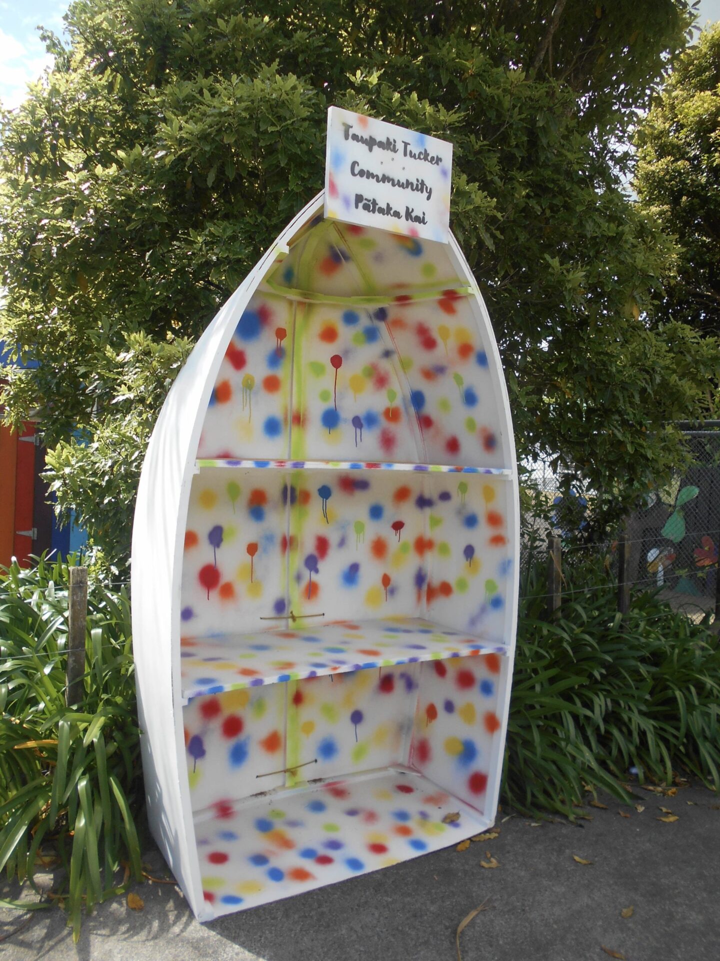 We wanted to tap into these amazing qualities and saw an opportunity for a community pantry – a Pātaka Kai that folk with extra produce could offer up for those without. We were gifted a boat shell that had the perfect shape to provide a character-filled, fun and vibrant casing to house the community’s offerings.