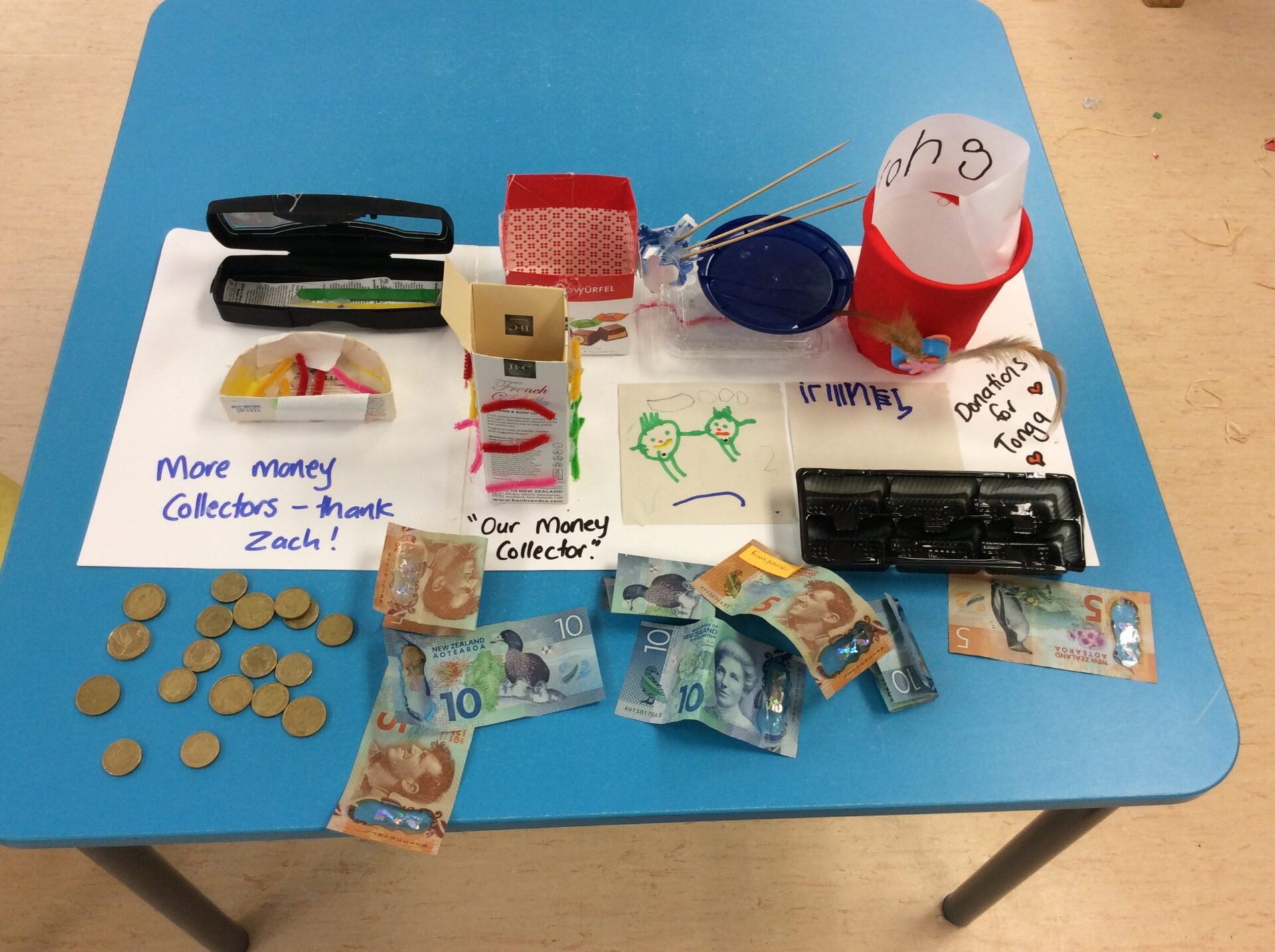 “We wore red (some children forgot) and the children made so many money collecting buckets – it started with just decorating one … the next minute we had about 5 on the go. We raised $85 in total. Our Teacher Aide Rae is a drummer and she bought in a few of her Pasifika drums for a big music session. We made cultural prints and talked a lot during the days prior about why we were raising money for our friends in Tonga. The children all understood what happened with the volcano as this is a big interest in the sandpit, and we also talked about the huge wave that swept through the villages.”